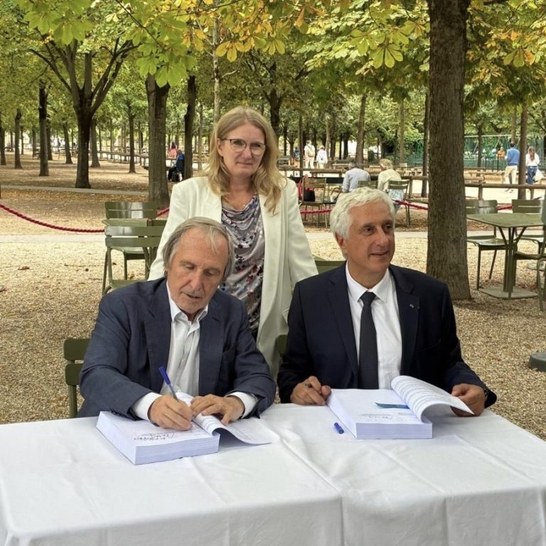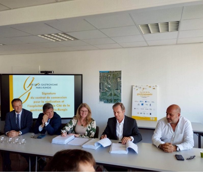 Stéphanie Daumin, Présidente du Syndicat de la Cité de la gastronomie et Alexis Moreau, représentant de la Société concessionnaire, ont officiellement signé le contrat de concession pour la réalisation et l’exploitation de la Cité de la gastronomie Paris-Rungis et la promesse de vente des terrains du programme immobilier annexe, en présence des avocats (Peyrical & Sabattier Avocats, Taylor Wessing) et des notaires (14 Pyramides Notaires et 137 Notaires) qui ont œuvré à leur rédaction.