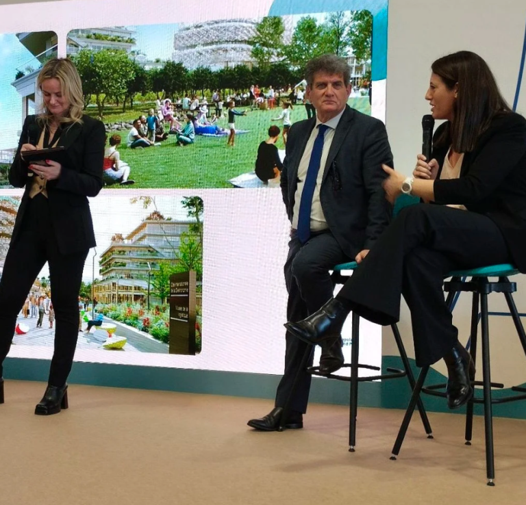 De gauche à droite : Cécile MAISONNEUVE, modératrice, Bruno MARCILLAUD, Maire de Rungis et Président du Syndicat de la Cité de la gastronomie, et Alexandra DUBLANCHE, Vice-Présidente de la Région Ile-de-France chargée de l’attractivité et du développement économie.